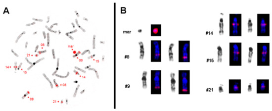 - Blennow, E.; Telenius, H.; Larsson, C.; de Vos, D.; Bajalica, S.; Ponder, B.A.; Nordenskjold, M. Complete characterization of a large marker chromosome by reverse and forward chromosome painting. Hum. Genet. 1992, 90, 371–374. [Google Scholar] [CrossRef]
