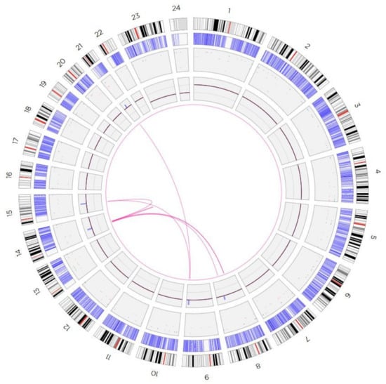 Circos plot depiction of the optical mapping results, showing the interconnections between involved chromosomal regions on the presented sSMC.
