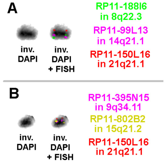 Three-color FISH results on the sSMC with locus-specific probes as specified on the figures are shown; the sSMC is presented as inverted DAPI stained with FISH results. Due to small distance between the probes on the sSMC, the order of the probe signal for 14q21.1 and 8q22.3 (A) and those for 9q34.11 and 15q21.2 (B) could not be determined by FISH. However, the linear and principal order of them was in concordance with the optical mapping result.