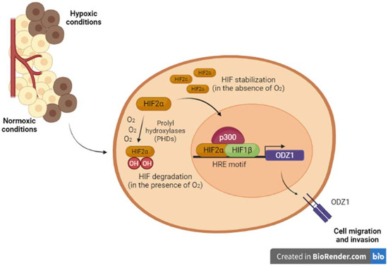 Tumor cells respond to the hypoxic microenvironment through changes in gene expression. It is known that hypoxia stimulates signaling pathways such as those triggered by PI3K/Akt and tyrosine kinase receptors [59,60,61]. With this in mind, our group evaluated whether ODZ1 could also be upregulated under hypoxic conditions, as is the case of other proteins involved in migration. It was found that hypoxia promoted ODZ1 expression by two different mechanisms: activation of hypoxia-inducible factors (HIFs) and epigenetic changes of the ODZ1 promoter.