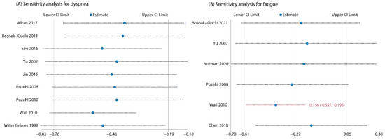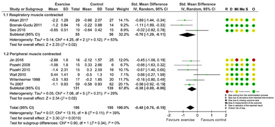 | Chen, et al., 2018 (Taiwan, China) [45] | IG: 39 CG:41 | 70.3 (13.5) | 47.5% | NR | 58.6 (15.6) | NR | Respiratory and Peripheral | 35 min per session, 3 sessions per week for 3 months | No | Home | Baseline, 1 2, and 3 months | 1. Fatigue (Chinese PFS) |