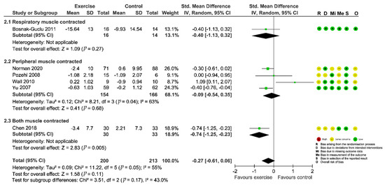 | Jin and Lee, 2016 (Korea) [41] | IG: 32 CG: 28 | 58 (12) | 26.8% | NR | 31.2 (6.9) | 12.2% | Peripheral | 50 min per session, 5 sessions per week for 3 months | Yes | Home | Baseline and 3 months | 1. Dyspnea (DFI) |