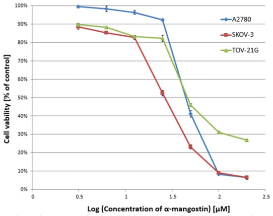 This study focuses on the possibility of using α-mangostin alone or in combination with cisplatin, currently used in ovarian cancer chemotherapy. α-Mangostin has a broad anticancer effect, inter alia, in colorectal cancer [], lung cancer [], kidney cancer [], breast cancer [], squamous cell carcinoma of the head and neck [], and ovarian cancer [].