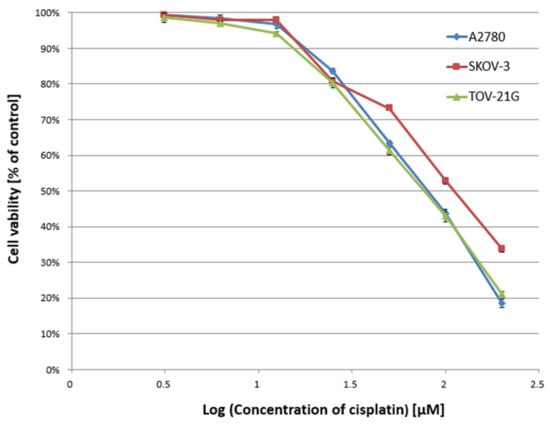Effect of cisplatin on the viability of A2780, SKOV-3, and TOV-21G human ovarian cancer cells measured by XTT assay and analyzed with ANOVA test. The cells were treated with indicated concentrations of modulators for 24 h. The data are shown as mean ± SD of triplicate experiments. All of the results were statistically significant (p < 0.001) between the cells treated with the different concentrations of modulators and the untreated control cells.