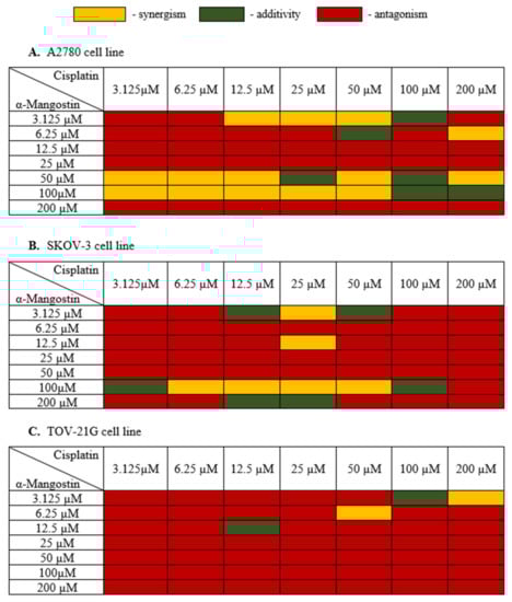 The studies were carried out on three different cell lines of ovarian cancer. Epithelial ovarian cancer (EOC) is the most common type. In our research, represented by the A2780 line. It is characterized by both the ease of relapse and the ease of metastasis. Hence, the high mortality among women suffering from EOC []. The main cause of EOC development is hereditary mutations. They often involve mutations in BRCA1 or BRCA2 or, to a lesser extent, mutations in RAD51C, RAD51D, PALB2, and FANCI. Most EOC tumors are also characterized by a p53 mutation []. Clear cell carcinoma (CCC) of the ovary is a less common type of ovarian cancer, and the TOV-21G line represents it in our research. Clear cell carcinoma is strongly associated with the incidence of endometriosis. Endometriosis is believed to be the direct cause of this type of ovarian cancer. However, it is associated with a good prognosis []. The most common mutations in CCC are mutations in the ARID1A gene and the PIK3CA gene []. The last cell line tested was SKOV-3. Cells of this line represent adenocarcinoma of the ovary. In our research, SKOV-3 cells were cisplatin-resistant. The above-described differences between the tested lines indicate a considerable variation among ovarian cancer cells. Hence, our results were distinctive for each tested cell line. Despite such a large variety, we observed that the joint treatment of cells with cisplatin and α-mangostin allows the reduction of the cisplatin dose. Ovarian cancer is not the only cancer for which new drugs are being sought. New independent substances with anticancer activity are sought, which could be combined with currently used drugs [,,].