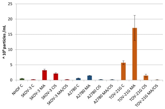 Our research tested the following three different ovarian cancer cell lines: A2780 (epithelial ovarian cancer cell line), cisplatin-resistant SKOV-3, and TOV-21G (grade 3, stage III, primary malignant adenocarcinoma; clear cell carcinoma). Among three of the analyzed cell lines, the cisplatin-resistant SKOV-3 cell line released the smallest number of exosomes, while the cells of advanced follicular carcinoma TOV-21G released significantly more. Interestingly, in all cases, a significant increase in the number of exosomes was observed after the treatment with α-mangostin. The observed variability of secreted exosomes was caused by both the origin of the tumor cells themselves and the different therapeutic approaches (using α-mangostin and/or cisplatin). This indicates the great individuality of cancer itself and the need for personalized treatment. For each examined ovarian cancer line, the secretion of the highest number of exosomes was observed after treatment with α-mangostin (in relation to the number of exosomes derived from untreated cells). A smaller number of exosomes were secreted after treatment with cisplatin. The lowest exosomes were observed after treatment with both α-mangostin and cisplatin. Perhaps the protective effect of α-mangostin, described in the literature in cells treated with the simultaneous action of cisplatin [,], also translates into a reduction in the number of exosomes secreted by these cells.