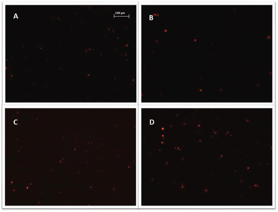 Representative images, exosomes (visible as red vesicles) stained with Vybrant ™ CM-Dil dye and purified on exosome spin columns (MW 3000), exosomes isolated from: (A) cisplatin treated A2780 cells; (B) α-mangostin treated TOV-21G cells; (C) cisplatin treated SKOV-3 cells; (D) untreated SKOV-3 cells. Nikon Eclipse Ti, magnification × 100.