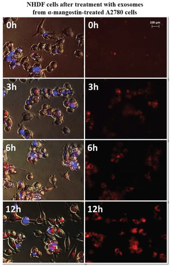 Representative photos of NHDF cells treated with exosomes derived from α-mangostin-treated A2780 cells at 0, 3, 6, and 12 h after treatment. Left: merged images of cells in visible light, DAPI stained cells (blue) and Vybrant™ CM-Dil stained exosomes (red), right: Vybrant ™ CM-Dil stained exosomes (red). Nikon Eclipse Ti, magnification × 20.