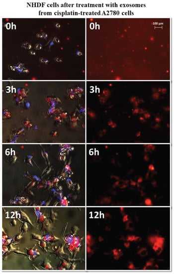 Representative photos of NHDF cells treated with exosomes derived from cisplatin-treated A2780 cells at 0, 3, 6, and 12 h after treatment. Left: merged images of cells in visible light, DAPI stained cells (blue) and Vybrant™ CM-Dil stained exosomes (red), right: Vybrant ™ CM-Dil stained exosomes (red). Nikon Eclipse Ti, magnification × 20.