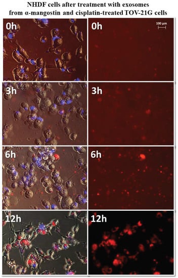 Representative photos of NHDF cells treated with exosomes derived from α-mangostin and cisplatin-treated TOV-21G cells at 0, 3, 6, and 12 h after treatment. Left: merged images of cells in visible light, DAPI stained cells (blue) and Vybrant™ CM-Dil stained exosomes (red), right: Vybrant ™ CM-Dil stained exosomes (red). Nikon Eclipse Ti, magnification × 20.