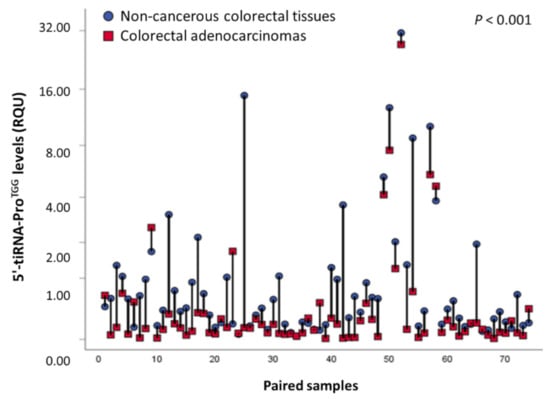 Comparison of 5′-tiRNA-ProTGG levels in pairs of malignant colorectal tissues and adjacent non-cancerous mucosae.