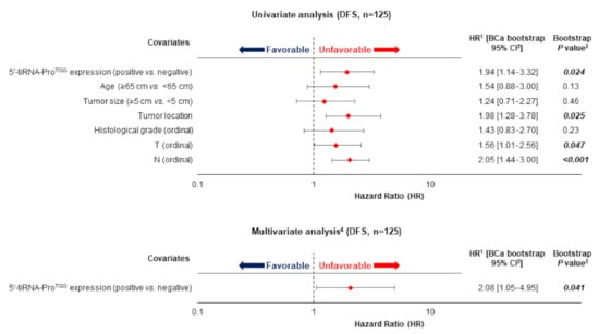 3.2. Elevated 5′-tiRNA-ProTGG Levels Are Associated with Poor DFS Independently of the Established Prognosticators