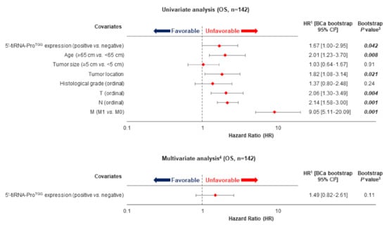 Concerning the OS of CRC patients, Kaplan-Meier curves demonstrated that 5′-tiRNA-ProTGG-positive patients had lower OS probability than patients with 5′-tiRNA-ProTGG-negative tumors (p = 0.036; Figure 3). Furthermore, survival analysis within the cohort of non-metastatic CRC patients (M0), unveiled that 5′-tiRNA-ProTGG—positive patients had a lower OS time interval compared to the negative ones (p = 0.033; Figure S4). This tendency was further enhanced by Cox univariate regression analysis results (Figure 4), which also indicated that patients with 5′-tiRNA-ProTGG-positive tumors were at a higher risk of death, compared to the negative ones (HR = 1.67, 95%, Bootstrap BCa 95% CI = 1.00–2.95, bootstrap p = 0.042). However, when tiRNA-ProTGG expression status was included in a multiparametric Cox regression model along with all the important clinicopathological parameters failed to retain its independent prognostic power in CRC [HR = 1.49, Bootstrap BCa 95% CI = 0.82–2.61, bootstrap p = 0.11].