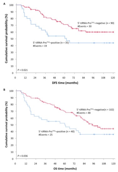 Kaplan–Meier survival curves for (A) disease-free survival (DFS) and (B) overall survival (OS) of colorectal cancer (CRC) patients. CRC patients with 5′-tiRNA-ProTGG-positive tumors demonstrate significantly shorter DFS and OS intervals, compared to patients with 5′-tiRNA-ProTGG-negative ones.