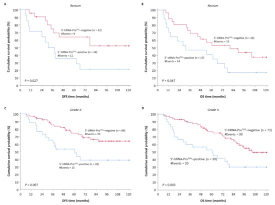 To further evaluate the prognostic value of 5′-tiRNA-ProTGG expression status, patients were stratified based on important clinicopathological variables, such as tumor location and tumor grade. Initially, the significance of 5′-tiRNA-ProTGG expression status was evaluated regarding tumor location. Patients whose tumor is located in rectum and overexpresses 5′-tiRNA-ProTGG demonstrated a significantly higher probability of tumor recurrence (p = 0.027) (Figure 5A) and inferior OS (p = 0.047) (Figure 5B). Subsequently, we classified CRC patients according to the histological grade of their tumor. The lack of cases corresponding to well- and poorly differentiated tumors confined our analysis only in the subgroup of patients with moderately differentiated colorectal tumors. Finally, Kaplan-Meier survival analysis demonstrated that the elevated 5′-tiRNA-ProTGG levels in patients with grade II CRC were associated with short DFS (Figure 5C) and OS (Figure 5D) time intervals.