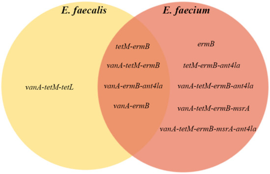 The most common associations of ARGs in E. faecium were vanA-tetM-ermB (29.4%), vanA-ermB (17.6%), and vanA-ermB-ant4la (14.7%). Other associations are listed in Table 5.