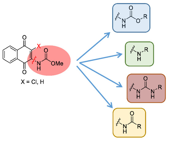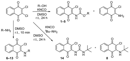 - Bittner, S.; Temtsin, G.; Sasson, Y. Synthesis of N-quinonyl carbamates via 2-chloro-3-isocyanato-1, 4-naphthoquinone. Synthesis 2000, 2000, 1084–1086. [Google Scholar] [CrossRef]