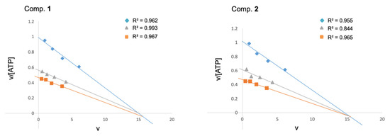 The mechanism of inhibition of LdGSK-3s by 1 and 2 was studied as described for hGSK-3β [49]. Briefly, kinetic experiments were carried out at four different concentrations of ATP (10, 5, 2.5, and 1 µM), in the absence or presence of the inhibitors, at either 2.5 or 5 µM, while the phospho-glycogen synthase peptide-2 (GS2) substrate was kept constant at 25 µM. The data were processed using Microsoft Excel software and results presented as Eadie–Scatchard plots (v vs. v/[ATP]).