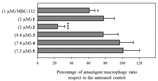 Mouse peritoneal macrophages resuspended in RPMI 1640-HIFCS were seeded in a 24-well plate (2 × 105 cells/well) with sterile 14 mm-diameter coverslides placed at the bottom of each well. Cells were allowed to adhere to the glass surface of the coverslides (24 h, 37 °C, 5% CO2). Initial infection was carried out with mCherry–L. pifanoi (amastigote: macrophage ratio 3:1) at 32 °C for 4 h in RPMI 1640-HIFCS. After removal of the non-phagocytized amastigotes (3 times wash with 1 mL warm phosphate-buffered saline PBS) the infection was allowed to progress at 32 °C for another 24 h. Next, cells were incubated with each compound at 32 °C for 20 h. The infection index (number of amastigotes per macrophage) was evaluated by fluorescence microscopy (Leica DIALUX 20, Leica Microsystem, L’Hospitalet de Llobregat, Spain). At least 6 different fields gathering up to 100 macrophages were counted in each preparation. Statistical significance was calculated by p values using Student’s t-test. Each sample was made by duplicate and experiments were repeated at least twice.