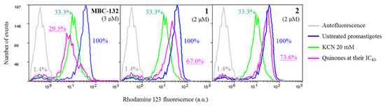 Variation of the mitochondrial membrane polarization was evaluated by the intracellular accumulation of rhodamine 123 (Rh123) [50]. Leishmania parasites at 20 × 106 cells/mL in Hanks buffered salt solution supplemented with 10 mM D-glucose (HBSS-Glc) were incubated with the compounds for 4 h either at 26 °C or 32 °C for promastigotes or amastigotes, respectively. Then, cells were washed by centrifugation (4 min, 13,000× g, 4 °C) and the cells resuspended in 100 μL HBSS-Glc plus 0.3 μg/mL Rh123, incubated for 10 min in darkness. Extracellular Rh123 was removed by washing in cold HBSS-Glc. Lastly, the cells were resuspended in 900 μL HBSS-Glc and measured in a Coulter XL EPICS flow cytometer (λEXC = 488 nm, λEM = 520 nm).