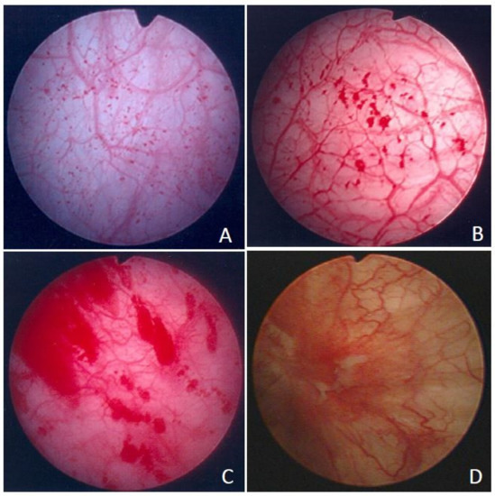 Cystoscopic findings of patients with interstitial cystitis/bladder pain syndrome. (A) Grade 0–1 glomerulation with petechiae that developed after hydrodistention, (B) grade 2 glomerulation with diffused hemorrhage, (C) grade 3 glomerulation with splotch hemorrhage and occasional mucosal fissure, and (D) Hunner’s lesion, which can be commonly observed without anesthesia or hydrodistention. The arrows indicate the top of cystoscopic pictures.