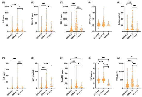 Association between urinary biomarker levels and global response assessment of patients with interstitial cystitis/bladder pain syndrome after treatment. GRA: global response assessment, GRA = 3 significantly improved, GRA = 2: moderately improved, GRA = 1, mildly improved, GRA = 0: not improved. (A) Interleukin-8 (IL-8), (B) C-X-C motif chemokine ligand 10 (CXCL 10, (C) MCP-1, monocyte chemoattractant protein-1 (MCP-1), (D) brain-derived neurotrophic factor (BDNF), (E) eotaxin-1 (eotaxin-1), (F) IL-6, (G) macrophage inflammatory protein-1 beta (MIP-1β), (H) regulated upon activation, normally T-expressed and secreted protein (RANTES), (I) tumor necrosis factor-alpha (TNF-α), (J) prostaglandin E2 (PGE2). *: p value < 0.05, **: p value < 0.01, ***: p value < 0.001.