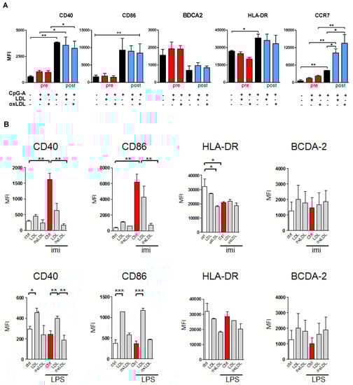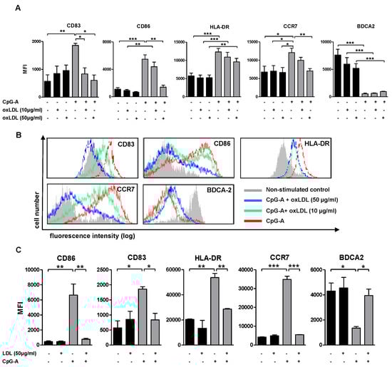 To address the effects of oxLDL accumulation on pDC maturation, we incubated human pDCs for 24 h with oxLDL (0, 10 and 50 μg/mL) in the absence or presence of CpG-A (2.5 µM). CpG-A activated pDCs acquired a characteristically mature phenotype compared to non-stimulated controls, as demonstrated by a significantly increased expression of maturation markers, including CD83, CD86, HLA-DR and the lymphoid-homing receptor CCR7 (Figure 1A,B). BDCA-2, a pDC specific type II C-type lectin [], is highly expressed in immature pDCs, but down-regulated in mature pDCs, rendering it a useful marker for immature pDCs. As expected, CpG-stimulated pDCs showed significantly decreased BDCA-2 expression (p < 0.001; Figure 1A). OxLDL pretreatment quenched the CpG-A induced surface expression of CD83, CD86, HLA-DR and CCR7 in a dose-dependent manner, to levels comparable to that of immature pDCs (Figure 1A). In contrast, BDCA-2 surface expression remained unexpectedly low in CpG-A/oxLDL co-stimulated pDCs (Figure 1A). Bioactive oxidized lipids, such as oxidized phospholipids contained in oxLDL, can profoundly impact the course of an immune response [], as has been reported for pDC activation, amongst others. To dissect the contribution of oxidized lipid constituents we assessed the effects of LDL (50 µg/mL) on pDC maturation in a similar setup. Treatment with LDL did not influence pDC maturation status. However, like oxLDL, LDL also abrogated CpG-induced pDC maturation as indicated by the significant down-regulation of CD83, CD86, HLA-DR and CCR7, as well as by the concomitant up-regulation of BDCA-2 (Figure 1C).