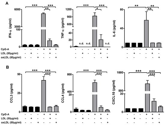 The LDL and oxLDL associated inhibition of TLR activation induced pDC maturation led us to investigate whether pDC cytokine production was also altered. In the context of systemic viral or bacterial infections, pDCs rapidly release large amounts of type I IFNs as well as other pro-inflammatory cyto- and chemokines, which promote lymphocyte recruitment to sites of infection [,,,]. Here, co-treatment of immature pDCs with LDL or oxLDL (both 50 µg/mL) and CpG-A for 24 h almost completely reversed the CpG-induced production of pro-inflammatory cytokines such as IFN-α, TNF-α and IL-6 (p < 0.001; Figure 3A). Additionally, CpG-A induced release of certain chemokines including CCL3, CCL4 and CXCL10 was nearly completely ablated, upon exposure to (oxidized) lipoproteins (p < 0.001; Figure 3B). Concentrations of IL-10, IL-12p70, and CCL5 were undetectable under all conditions tested (data not shown). Altogether, our data indicate that exposure to (modified) lipoproteins per se does not induce in vitro maturation of human pDCs; rather, it appears to quench CpG-A induced pDC activation.