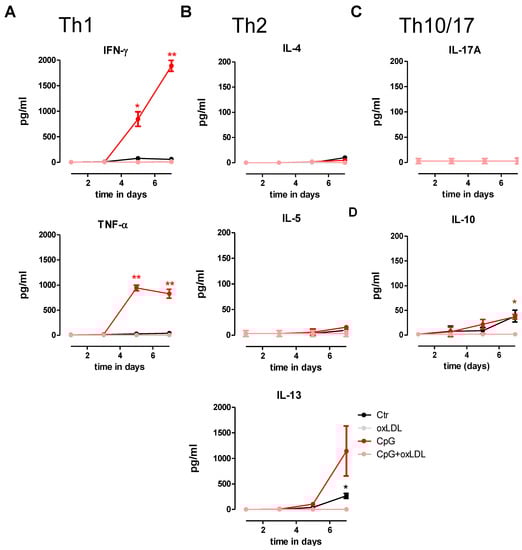 OxLDL skews T cell polarization of CpG-activated pDCs. Human autologous naïve CD4+ T cells were stimulated with immature CpG-A (2.5 µM) challenged pDCs, that had or had not been exposed to 25 µg/mL oxLDL, or with immature pDCs that had only been exposed to 25 µg/mL oxLDL. T cell polarization capacity (Th1, Th2, Th17 or Treg) was analyzed on day 1, 3, 5 and 7 of co-culture by measuring T cell cytokines in the cell supernatant (CBA kit). (A) Measurement of Th1 cytokines IFN-γ and TNF-α; (B) measurement of Th2 cytokines IL-4, IL-5 and IL-13; (C) measurement of Th17 cytokine IL-17A; (D) measurement of Treg cytokine IL-10. Data are shown as means of two independent experiments using different donor pDCs and T cells. * p < 0.05; ** p < 0.01 (color-coded according to treatment).