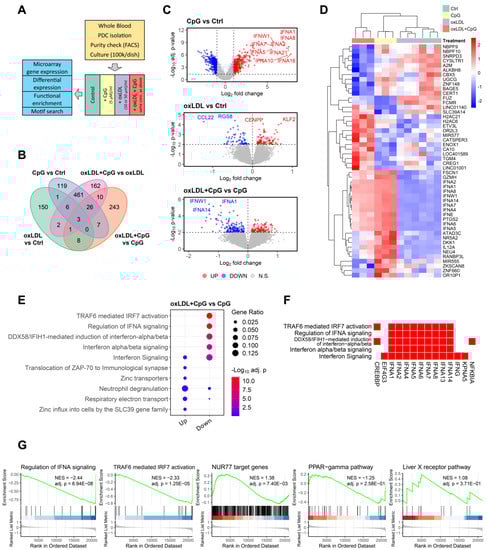 Transcriptional expression profiling reveals that oxLDL inhibits CpG-A induced activation by interfering with TRAF6 signaling and type-I interferon responses. (A) Flow scheme of the experimental setup of the profiling study. (B) DEGs of the four comparisons and their intersection. (C) Volcano plot of the gene expression data of CpG-A activated pDCs versus control (upper panel), oxLDL activated pDCs vs. control (middle panel), and CpG-A activated pDCs with/without oxLDL (lower panel). (D) Heatmap of gene expression of the 50 most significant oxLDL + CpG vs. CpG DEGs for the four study arms. (E) Gene set overrepresentation analysis of oxLDL + CpG vs. CpG DEGs. For either up-regulated or down-regulated DEGs, the five most significant reactome pathways are selectively shown. (F) Down-regulated oxLDL + CpG vs. CpG DEGs that are involved in the five Reactome pathways in (E). (G) Gene set enrichment analysis of oxLDL-induced overall gene expression upon CpG treatment (oxLDL + CpG vs. CpG, all genes). The two most significant Reactome pathways (first two), the 371 NUR77 targets retrieved from Harmonizome database [], as well as two pathways from WikiPathways database [] (last two) are selectively shown. For the comparison of oxLDL + CpG vs. CpG in (E–G), up-regulation, higher expression in oxLDL + CpG; down-regulation, higher expression in CpG.