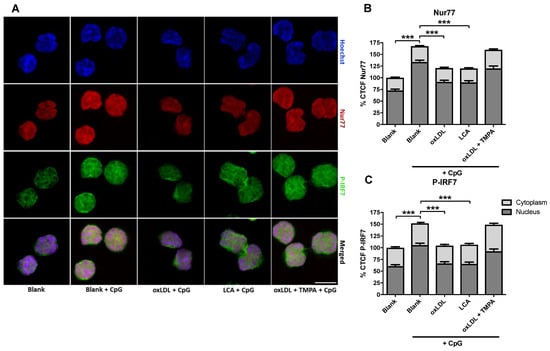 oxLDL (25 µg/mL), NUR77 agonist lithocholic acid (LCA, 20 µM) and/or NUR77 antagonist ethyl 2-[2,3,4-trimethoxy-6-(1-octanoyl)phenyl] acetate (TMPA, 20 µM). Non-stimulated pDCs were used as control. The cells were stained for IRF7. (A) Representative images of pDC phospho-IRF7 (green) and NUR77 expression (red); nuclei are counterstained by Hoechst 33342 (blue). (B,C) Quantification of the corrected total cell fluorescence (CTCF) for p-IRF7 and NUR77 staining revealed a marked inhibitory effect of oxLDL on CpG-mediated Ser471/2 phosphorylation of IRF7; this effect could be mimicked by Nur77 agonist LCA and rescued by co-treatment with the Nur77 ligand-binding domain antagonist TMPA. *** p < 0.001.