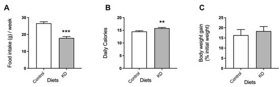 KD-fed mice consumed significantly less food than mice fed the control diet (Figure 1A). Nevertheless, due to the higher energy density of this diet (6.2 kcal/g KD versus 3.9 kcal/g control diet), KD-fed mice consumed more calories than the controls (Figure 1B). Notably, despite the higher number of calories consumed by the KD group than the controls, both groups of mice presented similar body weights (Figure 1C).