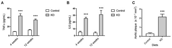 We next examined the effect of nutritional ketosis on the circulating levels of the pro-inflammatory cytokines TNF-α and IL-6 and on the volume of atheroma. The results suggested a sustained pro-inflammatory effect of the KD when compared to the control diet. Specifically, feeding the experimental diets for as little as 4 weeks resulted in significantly higher plasma concentrations of TNF-α and IL-6 in the KD mice than in the controls, which were maintained at 12 weeks (Figure 3A,B). Moreover, levels of aortic atherosclerotic plaque in KD-fed mice, as assessed by MRI, were significantly elevated compared to control levels (0.23 ± 0.03 versus 0.03 ± 0.01 mm3, mean ± SEM, n = 7–8) (Figure 3C).