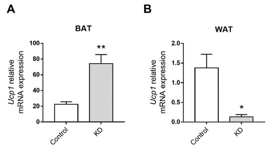 The finding of similar body weight in all mice, despite the higher caloric intake in the KD-fed group, was intriguing. BAT plays a vital role in energy homeostasis and heat production [70]. The thermogenic function of BAT is dependent on Ucp1, a protein expressed in the inner mitochondrial membrane of brown adipocytes [71]. Ucp1 disrupts the electrochemical gradient across the inner mitochondrial membrane, causing energy derived from the metabolism of food to be released as heat [71]. The exceptional function of BAT to increase energy expenditure is shown by its anti-obesogenic role. In fact, mice deficient in Ucp1 are susceptible to weight gain [72], whereas an excess of Ucp1 protects against diet-induced obesity [73]. In the present study, Ucp1 transcription in BAT of KD-fed mice was observed to be up-regulated as compared to the controls. Thus, it is tempting to speculate that this KD-induced up-regulation of Ucp1 may have contributed to the similar body weight of KD-fed mice and controls despite the first group having a higher caloric intake. Additional studies assessing basal metabolism are warranted to explore this exciting possibility.