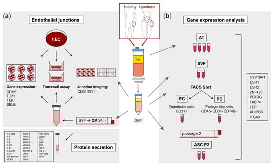 Schematic representation of the experimental set-up. Liposuction material of 4 healthy and 5 lipedema-affected subjects was used to isolate the stromal vascular fraction (SVF). (a) For fluorescence imaging of endothelial junctions, the SVF-contained endothelial cells (EC) of healthy and lipedema adipose tissue (AT) and human primary ECs (hEC) treated with conditioned media (CM) of healthy and lipedema SVF cells were stained for CD31 and ZO-1. After the treatment with CM, hECs were analyzed for endothelial permeability by a transwell assay and for gene expression of endothelial markers by quantitative real-time RT-PCR (qPCR). The CM of healthy individuals and lipedema patients were screened for protein secretion of inflammation and angiogenesis markers. (b) Samples of AT were collected from liposuction material of the thigh region of healthy and the thigh and abdominal regions of lipedema-affected subjects. CD31+ EC and CD45− CD31− CD146+ pericytes (PC) were isolated by fluorescence-activated cell sorting (FACS) of SVF. To achieve an adipose-derived stromal/stem cell (ASC) culture, SVF was cultivated for two passages. RNA was isolated from AT, SVF, EC, PC and ASC for gene expression analysis by qPCR.