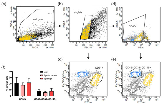 We next aimed at identifying cell types of the subcutaneous adipose tissue involved in lipedema pathology. Therefore, we isolated the SVF of liposuction material from the thigh region of both healthy and lipedema individuals (ctrl and lip thigh, respectively) and included liposuction material of the abdominal region of lipedema patients (lip abdomen) in all the analyses. Since the abdominal AT site is described as not being affected by lipedema, it serves as an endogenous control for the lipedema-affected thigh AT. From all the SVF samples, CD31+ EC and CD45− CD31− CD146+ PC were isolated by FACS (Figure 3a–e shows the gating strategy) and ASCs were collected after two passages of SVF cells. There was no difference in relative PC and EC counts between the control and lipedema samples (Figure 3f).
