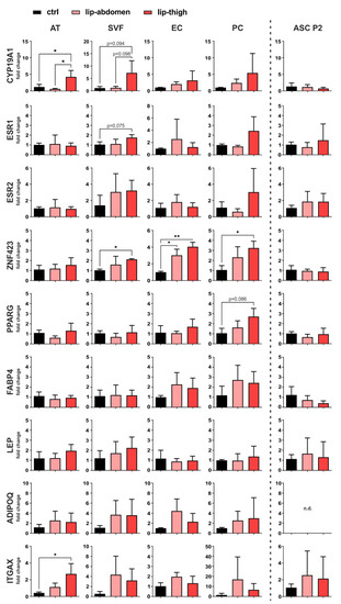 Gene expression analysis of factors involved in local estrogen metabolism, adipogenesis and inflammation. Subcutaneous adipose tissue (AT) of the thigh region collected from healthy individuals (ctrl: n = 3) and lipedema patients (lip-thigh: n = 4), as well as abdominal AT of lipedema patients (lip-abdomen: n = 3) served to isolate the stromal vascular fraction (SVF), which was in turn sorted for CD31+ endothelial cells (EC) and CD45− CD31− CD146+ pericytes (PC). SVF was cultivated and passaged two times to collect adipose-derived stromal/stem cells (ASC P2). RNA was isolated and quantitative real-time RT-PCR for gene expression analysis was performed. Fold change in gene expression (log scale) is normalized to ctrl expression levels and shown as mean ± SD. The p-values indicate the statistical significance of the group comparison (one-way ANOVA, Tukey’s post-hoc test); * p < 0.05, ** p < 0.01. Abbreviations: CYP19A1: cytochrome P450 family 19 subfamily A member 1, aromatase; ESR1: estrogen receptor 1; ESR2: estrogen receptor 2; ZNF423: zinc finger protein 423; PPARG: peroxisome proliferator-activated receptor gamma; FABP4: fatty acid binding protein 4; LEP: leptin; ADIPOQ: adiponectin; ITGAX: Integrin subunit alpha X, CD11C, n.d.: not detected.