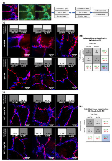 We used machine learning of artificial neural networks for classification of the fluorescence microscopy images. A detailed description and additional information to our applied method is presented in the Supplementary Materials (Figures S1–S12). In short, we applied the deep learning method convolutional neural networks (CNN). The CNN consisted of an input layer, grouped hidden layers and an output layer. Each grouped CNN hidden layer included a convolution layer, a rectified linear unit (ReLU) layer, a pooling layer, and optionally a normalization layer. The output layers formed a fully connected layer and a classification layer. The CNN input data were an image matrix with the size 250 × 250 pixels for each individual red, green, and blue channel. Each image was recorded in two channels, ZO-1 in the red channel (excitation at 647 nm) and CD31 in the blue channel (excitation at 492 nm). To increase the dataset, the image-data store was augmented with transformations of original images and combined images were saved in the green channel. After the augmentation and transformation process, each original image was represented by a group of 9 RGB images. For the first set of data (SVF-EC), we used 25 original images of lip-SVF and 33 original images of ctrl-SVF. To overcome the imbalance of the number of samples in the two groups, we generated duplicates of the underrepresented group for the training set. A total of 5 original images of each group were randomly selected as the test data set, resulting in 45 images per group/class (9 augmented images per original image). The remaining 252 images per group formed the training set. For the second set of data (CM-treated hEC), 120 original ctrl-CM images and 90 original lip-CM images were available. The groups were balanced by generating duplicates of images to train the network. A total of 9 RGB images were generated for each original image, which gave a total of 1080 RGB images per group, 936 images per group were included in the training data set and 144 images per group formed the test data set. After performing the training and test sessions, we calculated the recognition/classification accuracy of the network. The trained CNN was then used to calculate the posteriori probability of classification of individual images to the lip and ctrl group.