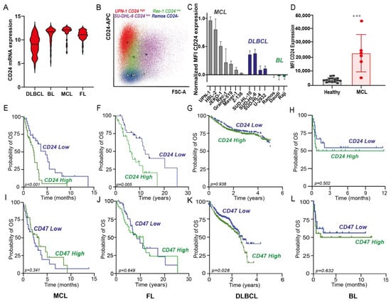 High mRNA expression of CD24 also significantly correlated with poor overall survival (OS) in MCL and FL compared to patients with low CD24 expression (Figure 1E,F). In contrast, CD24 did not correlate with OS in DLBCL patients treated with R-CHOP (Figure 1G), nor in separate cohorts of ABC or GCB DLBCL subtypes (Supplementary Materials Figure S1A,B) or BL (Figure 1H). Unlike CD24, mRNA expression levels of CD47 were similarly high in all lymphomas (Supplementary Materials Figure S1C). Further, the level of CD47 did not correlate with OS in MCL (Figure 1I), FL (Figure 1J), and BL (Figure 1L), but high expression of CD47 did negatively correlate with OS in DLBCL (Figure 1K) as previously reported by us []. Therefore, CD24 might play a significant role in certain hematological malignancies, such as MCL and FL, in which the well-known immune checkpoint CD47 may be less relevant.