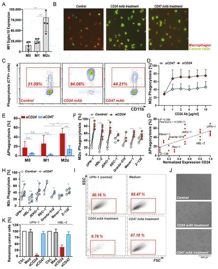 Finally, in contrast to CD47, whose ligand SIRPα is highly expressed in both M2 and M1 subtypes of macrophages, Siglec-10, the ligand of CD24 is expressed at the highest level in the M2c subtype. However, anti-tumoral activity is mostly attributed to the M1 macrophage type [,], with, e.g., the antitumor effect of CD47 mAb in mice being attributed to macrophage-mediated antigen presentation, likely through M1 macrophages, and activation of adaptive T cell immunity []. For CD24 mAb treatment, pro-phagocytic activity was strongest in M2c macrophages, which are typically reported to promote anti-inflammatory and pro-tumoral responses in the tumor microenvironment (TME) [,]. Thus, preferential activation of M2c phagocytosis may not be desirable in the end. Notably, CD24 mAb treatment also induced an, albeit more reduced, effect in M1 macrophages. Therefore, and regardless of the final mechanism behind CD24 mAb treatment, the ability of macrophages to present tumor-associated antigens and activate the adaptive immune response upon CD24 antibody treatment should be investigated to shed more light on the nature of the final immune response and its clinical implications.