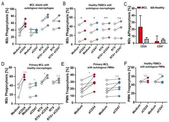 CD24 and CD47 antibody-mediated phagocytosis of MCL and healthy blasts by primary patient-derived autologous and allogeneic healthy donor macrophages. (A) Phagocytosis of MCL blasts by autologous macrophages upon CD24 mAb SN3 or CD47 mAb InhibRx treatment (n = 4) and combination treatment with RTX (n = 3). (B) Phagocytosis of healthy PBMCs by autologous macrophages upon CD24 mAb SN3 or CD47 mAb InhibRx treatment and in combination with RTX. (n = 3). (C) Comparison between phagocytosis levels induced upon CD24 and CD47 antibody treatment of MCL blasts (red) and healthy PBMCs (gray). (D) Phagocytosis of MCL blasts co-cultured with macrophages from healthy donors upon treatment with CD24 mAb SN3 or CD47 mAb InhibRx and in combination with RTX. (n = 3). (E) Trogocytosis of MCL blasts by autologous PMNs upon treatment with CD24 mAb SN3 or CD47 mAb InhibRx (n = 5). Statistical testing was performed using paired Student’s t-test. (F) Trogocytosis of healthy PBMCs by autologous PMNs upon treatment with CD24 mAb SN3 or CD47 mAb InhibRx (n = 3). Statistical testing was performed using paired Student’s t-test. Where indicated, n.s. = non-significant, * = p < 0.05; ** = p < 0.01.
