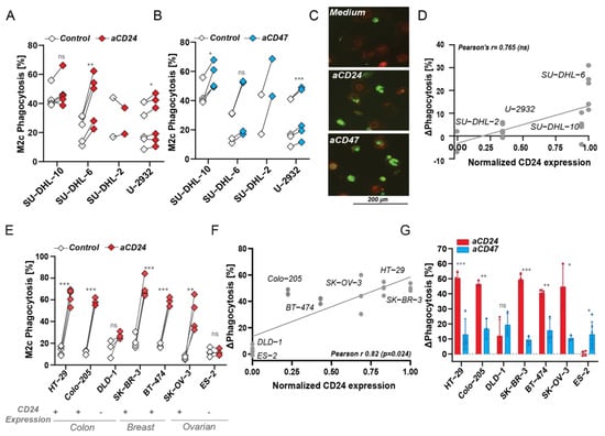 CD24 expression levels positively correlated with CD24 antibody-induced phagocytosis. (A) Percentage of phagocytosis upon CD24 SN3 antibody treatment vs. medium control by M2c macrophages (independent donors) in several DLBCL cell lines. Paired t-test. (B) Percentage of phagocytosis upon CD47 InhibRx antibody treatment vs. medium control by M2c macrophages (independent donors) in several DLBCL cell lines. Paired t-test. (C) Confocal microscopy images of phagocytosis of SU-DHL-6 where macrophages are in red and cancer cells are visible in green. (D) Correlation between CD24 expression and increase in phagocytosis upon CD24 SN3 treatment in DLBCL cell lines. CD24 expression was normalized to the highest value, corresponding to UPN-1 CD24 expression. Pearson’s r = 0.765 (ns) and linear regression p > 0.05. (E) Percentage of phagocytosis upon CD24 SN3 treatment vs. medium control by M2c macrophages (independent donors) in several colon (HT-29, Colo-205, DLD-1), breast (SK-BR-3, BT-474), and ovarian (SK-OV-3, ES-2) cell lines. Any effect was observed in CD24 negative cell lines (DLD-1, ES-2). Paired t-test. (F) Correlation between CD24 expression and increase in phagocytosis upon CD24 SN3 treatment in several colon (HT-29, Colo-205, DLD-1), breast (SK-BR-3, BT-474), and ovarian (SK-OV-3, ES2) cell lines. CD24 expression was normalized to the highest value, corresponding to SKBR3 CD24 expression. Pearson’s r = 0.82 (*) and linear regression p < 0.05. (G) Delta increase in phagocytosis compared to medium control upon CD24 and CD47 antibody treatment in several colon (HT-29, Colo-205, DLD-1), breast (SK-BR-3, BT-474), and ovarian (SK-OV-3, ES-2) cell lines. Student’s t-test. Where indicated, n.s. = non-significant, * = p < 0.05; ** = p < 0.01; *** = p < 0.001.