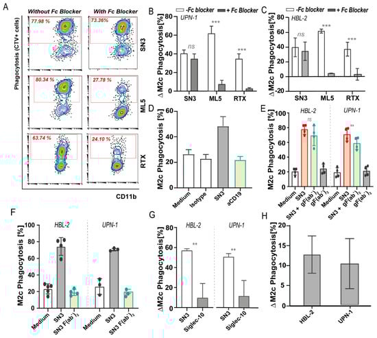 CD24 antibody treatment with two different murine anti-CD24 clones (SN3 and ML5) and Siglec-10 disruption of CD24/Siglec10 axis. (A) Flow cytometry diagrams showing the percentage of phagocytosis of UPN-1 cells upon CD24 antibody treatment with SN3 and ML5 clones by M2c macrophages in the presence or absence of high concentrations of Fc blocker. Rituximab (RTX) (anti-CD20) antibody was used as a control. (B) Increase in phagocytosis compared to medium control of UPN-1 cells upon CD24 antibody treatment with SN3 and ML5 antibody clones by M2c macrophages in the presence (gray) or absence (white) of high concentrations of Fc blocker. (C) Increase in phagocytosis compared to medium control of HBL-2 cells upon CD24 antibody treatment with SN3 and ML5 antibody clones by M2c macrophages in the presence (gray) or absence (white) of high concentrations of Fc blocker. n = 3, mean ± SD. n = 3, mean ± SD. Paired t-test, with p < 0.05 significant. (D) Phagocytosis of HBL-2 cells upon anti-CD24 (1 µg/mL, red) or anti-CD19 (10 µg/mL, green) treatment, being both mouse IgG1 antibodies. (E) Phagocytosis of HBL-2 and UPN-1 cells upon anti-CD24 treatment (SN3 clone) (red), same antibody pre-incubated with goat F(ab’)2 against mouse IgG Fc domain (gF(ab’)2) (green) or the goat F(ab’)2 alone (gray). Paired t-test, with p < 0.05 significant. (F) Phagocytosis levels of HBL-2 and UPN-1 cells upon CD24 SN3 treatment with the complete antibody (red) or F(ab’)2 preparations of the same antibody clone (SN3) (green). (G) Phagocytic uptake by M2c macrophages upon CD24 treatment with recombinant human Siglec-10 (His tagged) protein of HBL-2 and UPN-1 cells. (H) Increase in phagocytosis compared to medium control of HBL-2 and UPN-1 cells co-cultured with M2c macrophages previously incubated with 10 µg/mL of anti-Siglec-10 antibodies (5G6 clone). n = 3, mean ± SD. Where indicated, n.s. = non-significant, ** = p < 0.01; *** = p < 0.001.