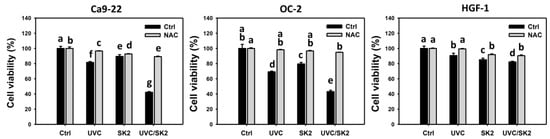 Cell viability at 24 h MTS assay. Oral cancer (Ca9-22 and OC-2) and normal oral (HGF-1) cells were treated with control, UVC (20 J/m2), SK2 (10 μg/mL), and UVC/SK2 (20 J/m2 and 10 μg/mL). Data indicate means ± SD (n = 4). The statistics of multiple comparisons were performed. The significance was judged from the connecting letters between different groups, i.e., showing a significant difference when the connecting letters were not overlapped (p < 0.05). For the example of OC-2 cells, the connecting letters for control, UVC, SK2, and UVC/SK2, showing ab, d, c, and e, indicate a significant difference between each other because they are not overlapped. Its untreated control and NAC control, showing ab and a, indicated a nonsignificant difference because they overlapped connecting letters.