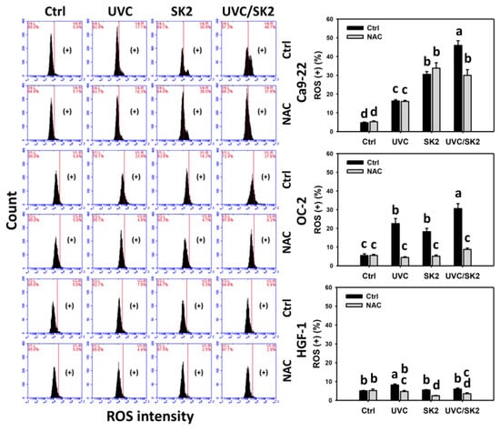 ROS analysis. Oral cancer (Ca9-22 and OC-2) and normal oral (HGF-1) cells were treated with control, UVC (20 J/m2), SK2 (10 μg/mL), and UVC/SK2 (20 J/m2 and 10 μg/mL). ROS (+) regions are marked with (+). Data indicate as means ± SD (n = 3). The statistics of multiple comparisons were performed. The significance was judged from the connecting letters between different groups, i.e., it showed a significant difference when the connecting letters were not overlapped (p < 0.05). For the example of Ca9-22 cells, the connecting letters for control, UVC, SK2, and UVC/SK2, showing d, c, b, and a, indicated a significant difference between each other because they were not overlapped. Its untreated control and NAC control, shown as d, indicated a nonsignificant difference because their connecting letters were overlapped.