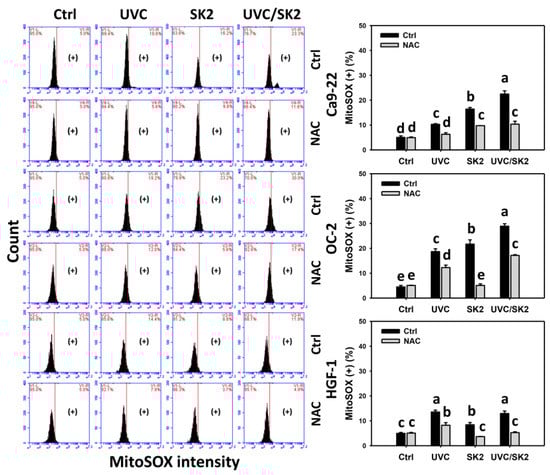 MitoSOX analysis. Oral cancer (Ca9-22 and OC-2) and normal oral (HGF-1) cells were treated with control, UVC (20 J/m2), SK2 (10 μg/mL), and UVC/SK2 (20 J/m2 and 10 μg/mL). MitoSOX (+) regions are marked with (+). Data indicate means ± SD (n = 3). The statistics of multiple comparisons were performed. The significance was judged from the connecting letters between different groups, i.e., it showed a significant difference when the connecting letters were not overlapped (p < 0.05). For the example of Ca9-22 cells, the connecting letters for control, UVC, SK2, and UVC/SK2, showing d, c, b, and a, indicated a significant difference between each other because they were not overlapped. Its untreated control and NAC control, showing d, indicated a nonsignificant difference because their connecting letters were overlapped.