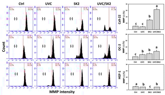 MMP analysis. Oral cancer (Ca9-22 and OC-2) and normal oral (HGF-1) cells were treated with control, UVC (20 J/m2), SK2 (10 μg/mL), and UVC/SK2 (20 J/m2 and 10 μg/mL). MMP (−) regions are marked with (−). Data indicate means ± SD (n = 3). The statistics of multiple comparisons were performed. The significance was judged from the connecting letters between different groups, i.e., it showed a significant difference when the connecting letters were not overlapped (p < 0.05). For the example of Ca9-22 cells, the connecting letters for UVC, SK2, and UVC/SK2, showing c, b, and a, indicated a significant difference between each other because they were not overlapped. Control and UVC, showing c, indicated a nonsignificant difference because their connecting letters were overlapped.