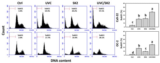 Cell cycle distribution. Oral cancer (Ca9-22 and OC-2) cells were treated with control, UVC (20 J/m2), SK2 (10 μg/mL), and UVC/SK2 (20 J/m2 and 10 μg/mL). Data indicate means ± SD (n = 3). The statistics of multiple comparisons were performed. The significance was judged from the connecting letters between different groups, i.e., it showed a significant difference when the connecting letters were not overlapped (p < 0.05). For the example of Ca9-22 cells, the connecting letters for control, UVC, and UVC/SK2, showing c, b, and a, indicated a significant difference between each other because they were not overlapped. UVC and SK2, showing b, indicated nonsignificant differences because their connecting letters were overlapped.