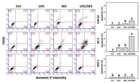Annexin V/7AAD assays. Oral cancer (Ca9-22 and OC-2) and normal oral (HGF-1) cells were treated with control, UVC (20 J/m2), SK2 (10 μg/mL), and UVC/SK2 (20 J/m2 and 10 μg/mL). Annexin V (+)/7AAD (−) and annexin V (+)/7AAD (+) regions were assigned to apoptosis. Data indicate means ± SD (n = 3). The statistics of multiple comparisons were performed. The significance was judged from the connecting letters between different groups, i.e., it showed a significant difference when the connecting letters were not overlapped (p < 0.05). For the example of Ca9-22 cells, the connecting letters for UVC, SK2, and UVC/SK2, showing c, b, and a, indicated a significant difference between each other because they were not overlapped. Control and UVC, showing c, indicated a nonsignificant difference because their connecting letters were overlapped.