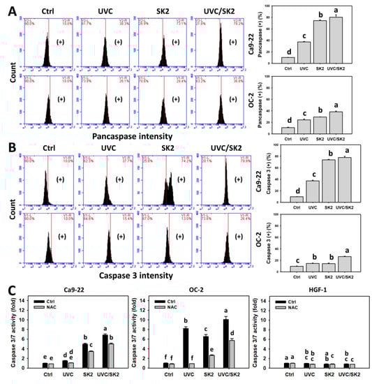 Pancaspase, caspase 3, and caspase 3/7 assays. Oral cancer (Ca9-22 and OC-2) and normal oral (HGF-1) cells were treated with control, UVC (20 J/m2), SK2 (10 μg/mL), and UVC/SK2 (20 J/m2 and 10 μg/mL). (A) Pancaspase and (B) caspase 3 (+) regions were marked with (+). (C) Caspase 3/7 activity. Data indicate means ± SD (n = 3). The statistics of multiple comparisons were performed. The significance was judged from the connecting letters between different groups, i.e., it showed a significant difference when the connecting letters were not overlapped (p < 0.05). For the example of (A) Ca9-22 cells, the connecting letters for control, UVC, SK2, and UVC/SK2, showing d, c, b, and a, indicated a significant difference between each other because they were not overlapped.